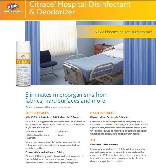 Kills microorganisms on soft surfaces, hard surfaces and more. Kills 99.9% of bacterial on soft surfaces in just 30 seconds. Kills 24 microorganisms on hard surfaces in five minutes. Eliminates odors from the air instantly while leaving a fresh citrus scent. Application: Disinfectant/Sanitizer; Applicable Material: Ceramic; Cement; Fiberglass; Glass; Grout; Laminates; Metal; Plastic; Vinyl; Dirt Types: Bacteria; Fungus; Germs; Mildew; Mold; Viruses; Scent: Citrus.