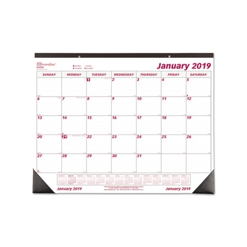 Professional desk pad calendar with bold, easy-to-read dates. One month per page, one ruled block per day. Reinforced chipboard back and vinyl corners. Tear-off sheets, bound at top. Yearly calendar at the bottom of each sheet. Size: 22 x 17; Page Color/Theme: White/Burgundy; Edition Year: Current Year; Calendar Term: 12-Month (Jan.-Dec.).
