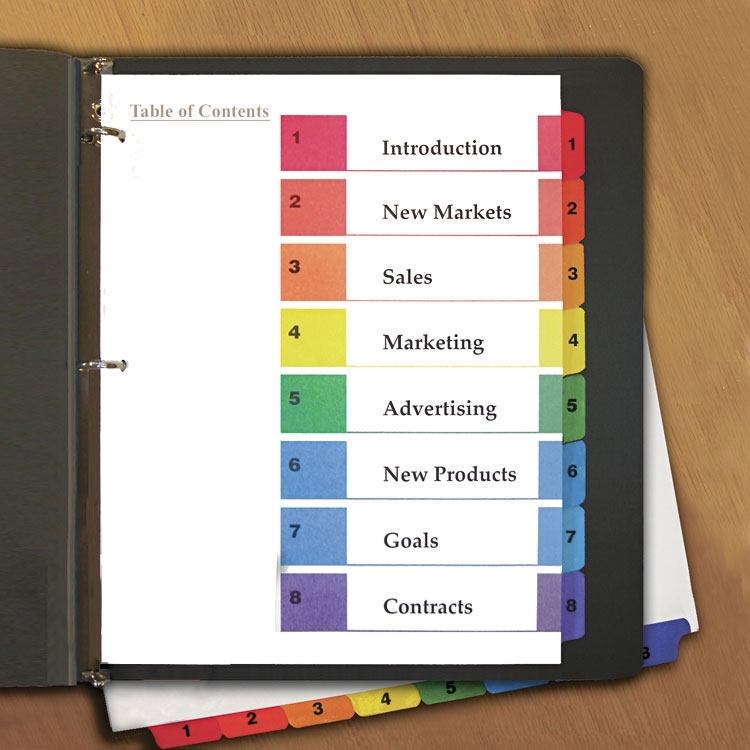 Simply print your selection titles on the Table of Contents page using your laser or inkjet printer. Three-hole punched white dividers feature multicolor laminated tabs and a Mylar-reinforced binding edge for use in standard ring binders. Adaptable to both portrait and landscape orientations. Tab Style: 8-Tab; Tab Color(s): Multicolor; Index Divider Size: 11 x 8 1/2; Form Quantity: 6.