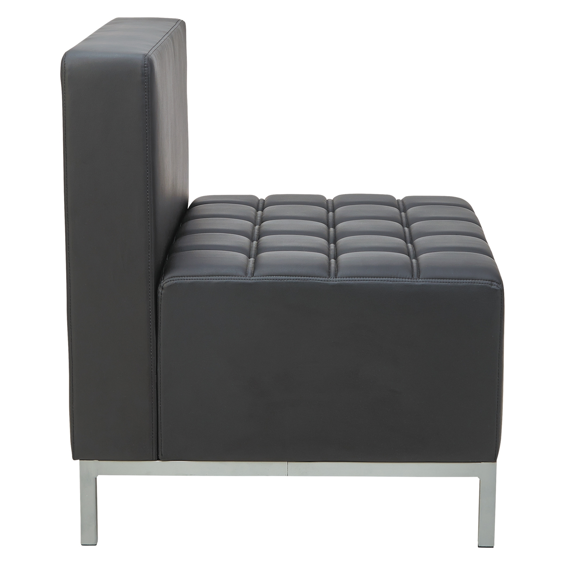 Contemporary geometric reception room sectional set can be configured in endless possibilities. Tufted seat design with straight backs and arms for a modern yet comfortable look. Armless sectional can be configured with corner sectional and ottoman. Silver steel frames and legs adds style. Offers guest the chance to get plugged in and charge electronics. Includes electrical outlet and 2 USB ports. Color: Black; Overall Width: 26 3/8"; Overall Depth: 26 3/8"; Overall Height: 30 1/2".