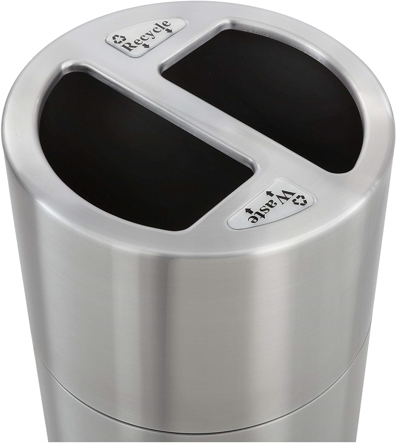 • QUALITY BUILD. Featuring an attractive brushed finish, the sleek aluminum shell of the Dual Recycling and Trash Can complements virtually any décor and helps ensure easy, wipe-down cleaning and long-lasting durability in a variety of indoor environments.