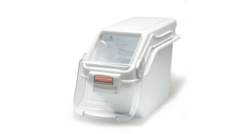 The Rubbermaid Commercial Shelf Ingredient Bin with Scoop offers quick one-handed access while stacked and an integrated measuring tool that increases preparation efficiency, space optimization, and promotes food safety compliance.
