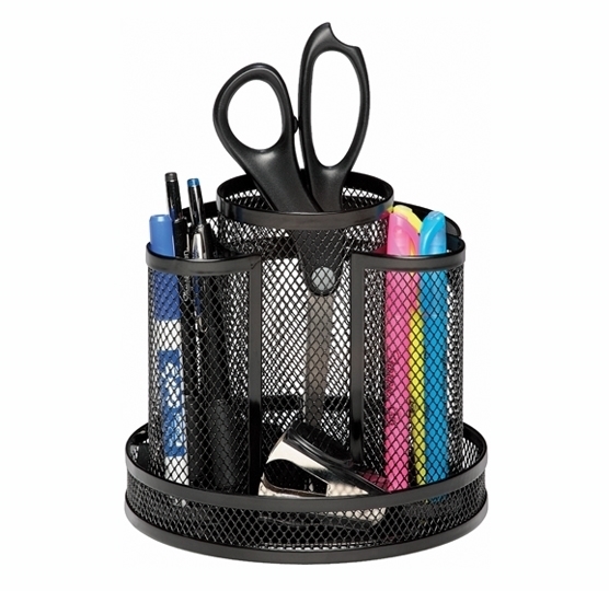 Handy rotating caddy keeps supplies within easy reach. Eight compartments separate pens, pencils, rulers and scissors. Shallow compartments for clips and other small items. Desktop Supplies Organizer Type: Pen/Pencil Cup Plus Storage; Number of Compartments: 8; Overall Width: 6 1/2"; Overall Depth: 6 1/2".